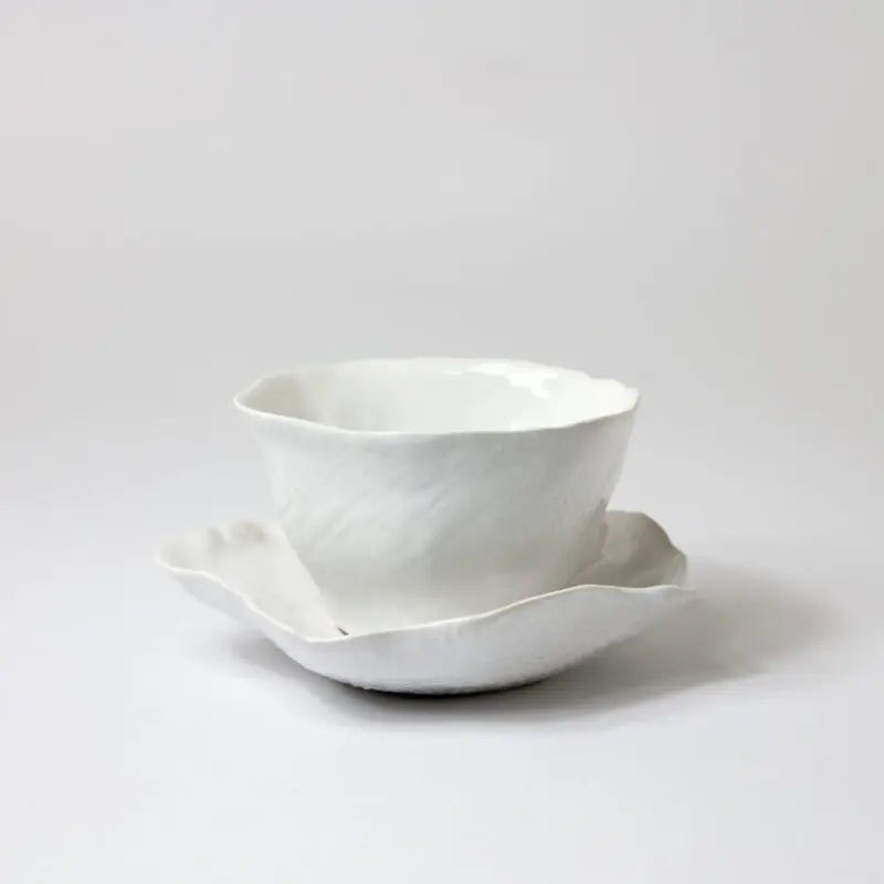 Forkæl dig selv eller dine gæster med denne smukke Claire kop med tilhørende underkop. Sættet er håndlavet i porcelæn med et organisk og let bølgende formsprog, der giver et unikt og elegant udtryk. Hver kop og underkop er en lille kunstnerisk oplevelse, hvor det enkle hvide design fremhæver den naturlige struktur og form.
