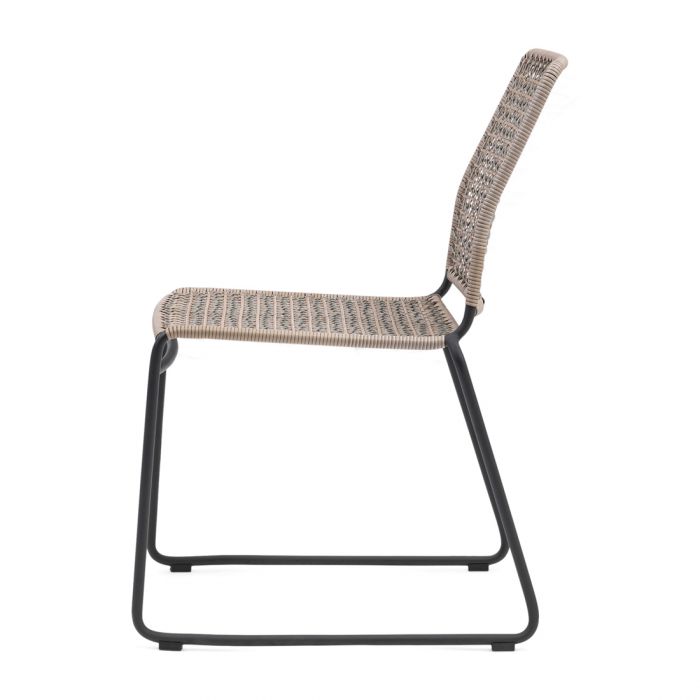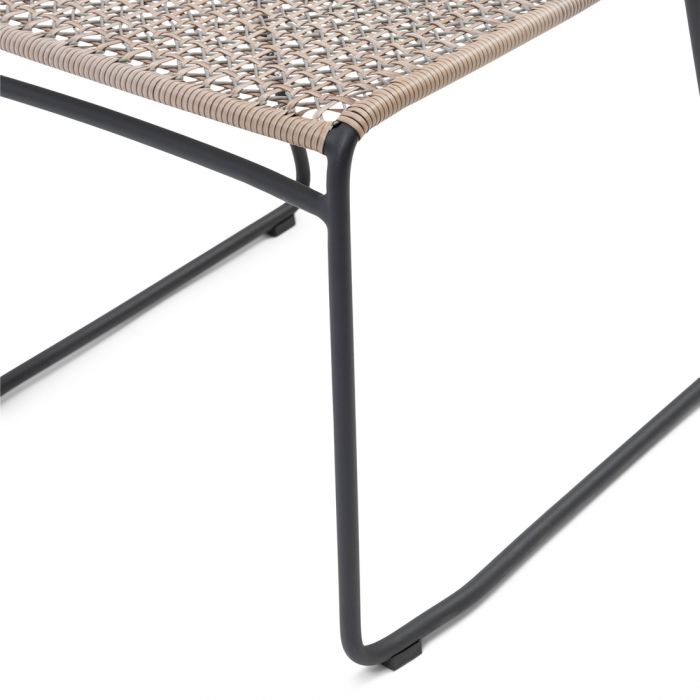 Den vejrbestandige flet er solidt fastgjort til metalbenene, og den kan nemt stables med andre Portofino udendørs stabelbare spisestole, når den ikke er i brug.