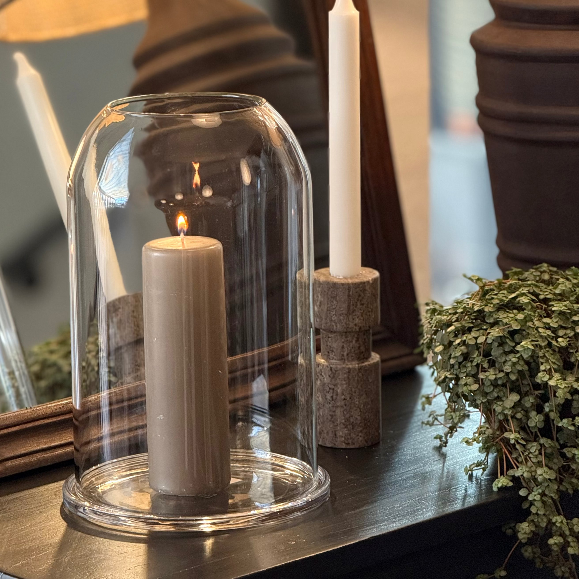 Klassisk stormlanterne i klart glas. For den bedste brændeffekt anbefales bloklys med følgende mål: Ø: 6,8, H: 14 cm.