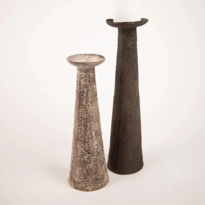 Denne elegante lysestage er skabt i et råt og rustikt design med en unik, varieret finish, der giver hver stage sit helt eget udtryk. Den slanke form gør den velegnet til bloklys og tilføjer et skulpturelt element til indretningen. Perfekt alene eller i kombination med flere stager i forskellige højder.