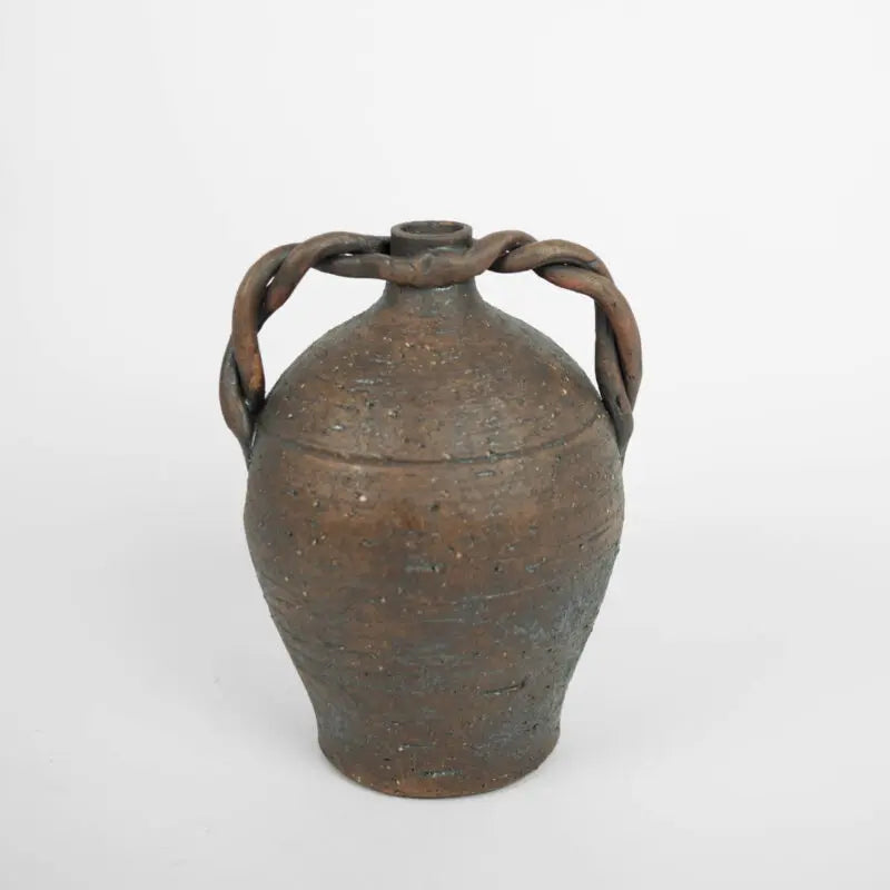 En dekorativ krukke i keramik med flettede ører. Farve og mønster kan variere, da urnen er håndmalet.