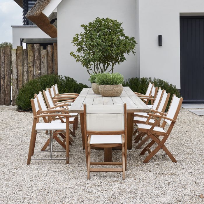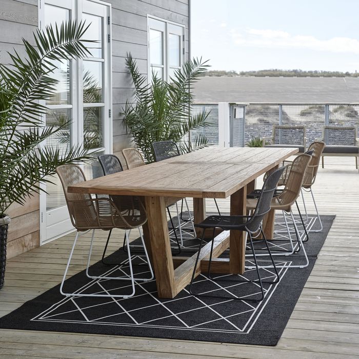 Dette udendørsbord måler 400 cm x 100 cm – perfekt til en stor sammenkomst på en sommeraften. Det er lavet af smukt teaktræ med en bar i bunden, hvilket giver det ekstra styrke og stabilitet.