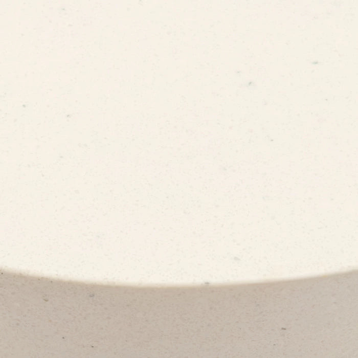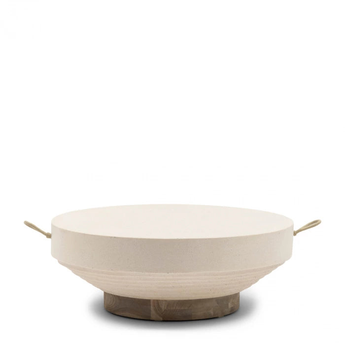 Det robuste, hvide udendørs sofabord har en diameter på ikke mindre end 80 centimeter og fås også i en mindre udgave på 60 centimeter. Det runde bord er lavet af glasfiber og teaktræ.